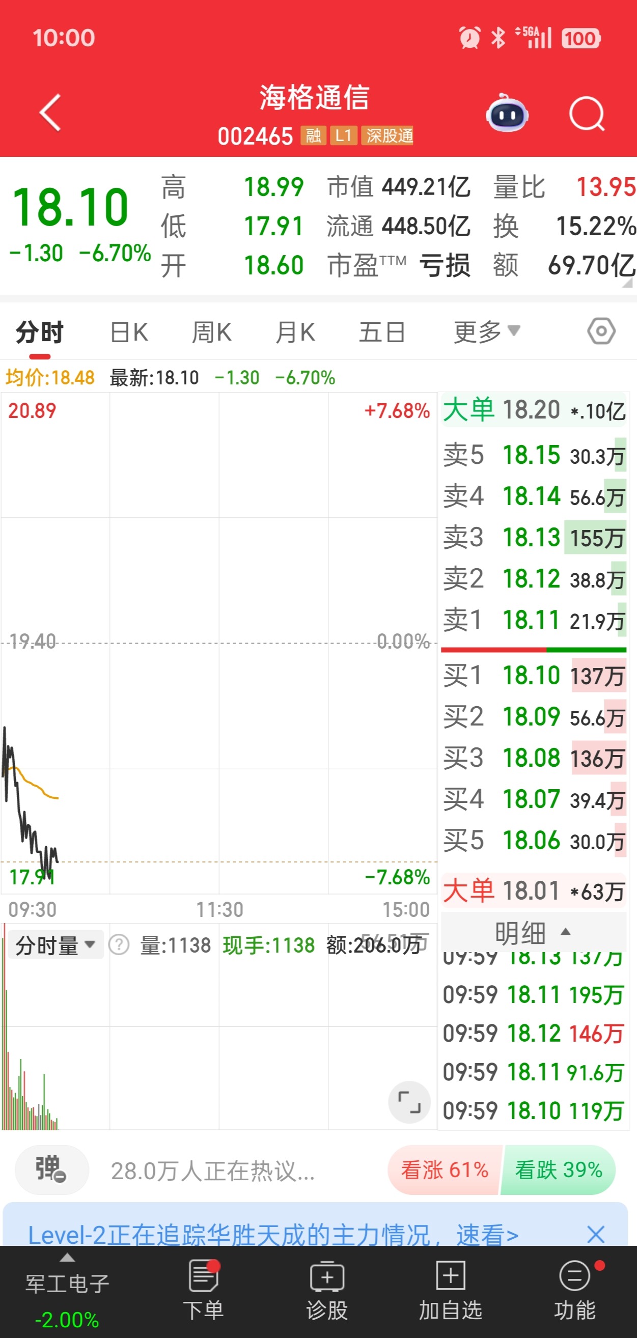 截至1月20日早10点,海格通信跌破开盘价,下跌6.7%,报18.10元/股,成交额近70亿元,换手率达到15.22%。