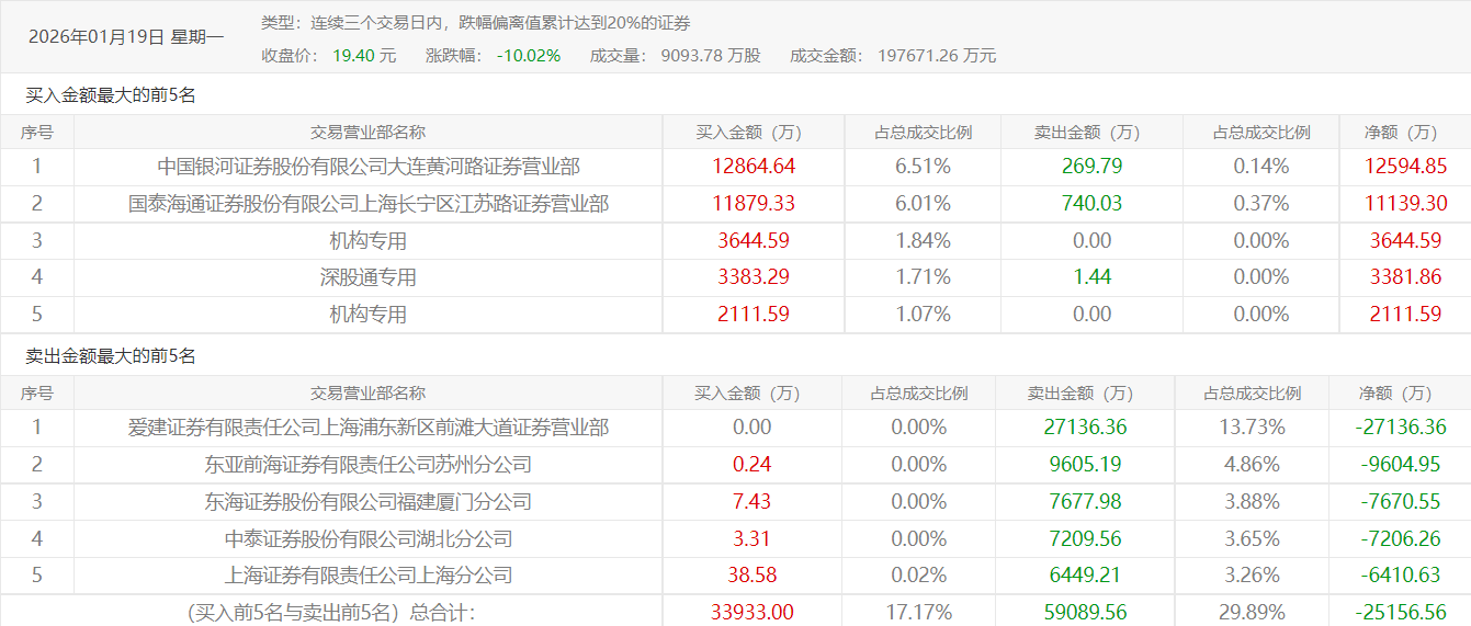 收盘后,神秘资金露出其真面目,就是知名游资“陈小群”所在席位中国银河证券股份有限公司大连黄河路证券营业部。据1月19日触发的三日榜数据显示,1月15日-19日三个交易日内,大连黄河路共买入1.29亿元,净买入1.26亿元。与19日尾盘集合竞价的神秘大单契合,市场普遍认为该神秘资金的主人就是我们“1年3个月20倍”的“陈小群”。