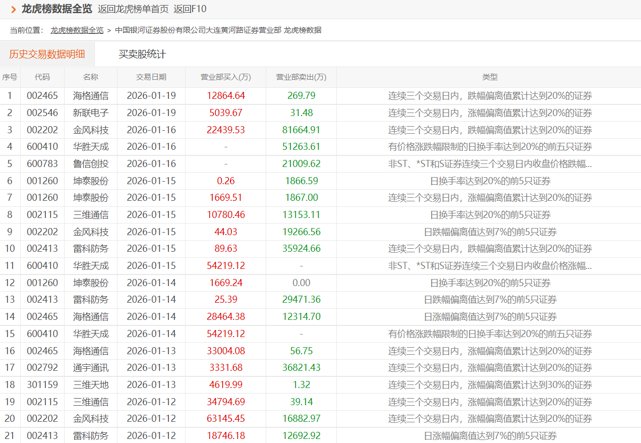 此前,在1月13日、14日,海格通信均出现涨幅异动,触发龙虎榜,其中都出现了大连黄河路的身影。在1月13日三日榜中,大连黄河路大手笔净买入3.295亿元;1月14日的单日榜中,大连黄河路再度净买入1.615亿元。4个交易日内,大连黄河路合计买入6.15亿元,卖出1.23亿元,净买入约4.91亿元。这表明,知名游资陈小群或在此次海格通信中套牢近5个亿资金。