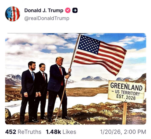 值得一提的是,当地时间今天(1月20日)凌晨,美国总统特朗普搭乘专机从佛罗里达州返回华盛顿途中,在其社交平台“真实社交”上发图,暗示吞并丹麦自治领地格陵兰岛。
