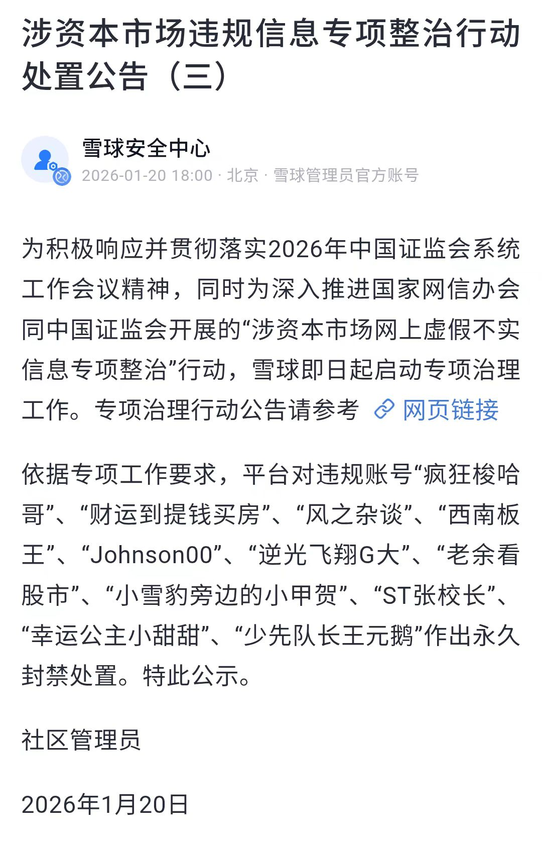 1月20日,雪球安全中心发布涉资本市场违规信息专项整治行动处置公告,为积极响应并贯彻落实 2026 年中国证监会系统工作会议精神,同时为深入推进国家网信办会同中国证监会开展的 “涉资本市场网上虚假不实信息专项整治” 行动,雪球即日起启动专项治理工作。
