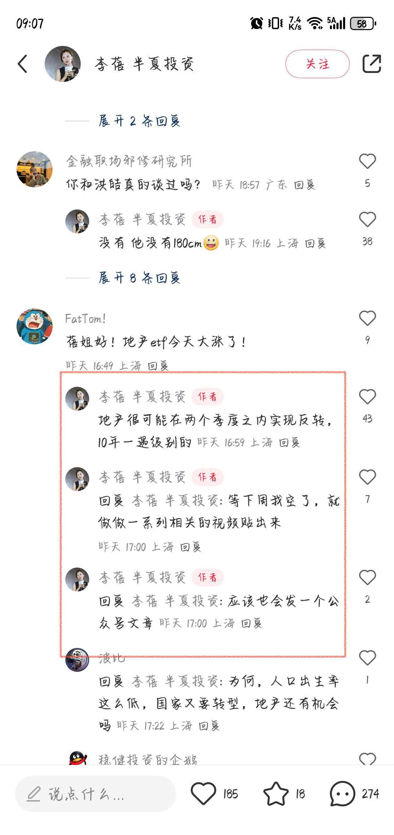 在评论互动区,李蓓回复称“地产很可能在两个季度之内实现反转,10年一遇级别的”,并表示“等有空会做一系列相关的视频贴”。