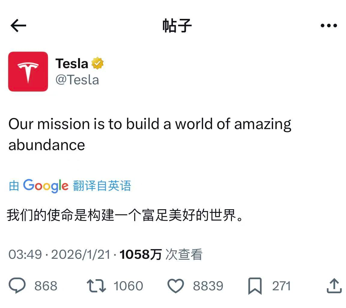 特斯拉正式修改公司使命为“构建一个惊人富足的世界”