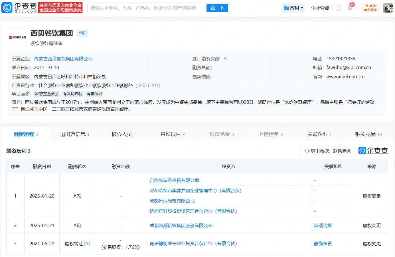 据企查查,内蒙古西贝餐饮集团有限公司获A轮融资。投资方包括台州新荣泰投资有限公司、呼和浩特市集体共创企业管理中心(有限合伙)、成都迅达光电有限公司、杭州舟轩股权投资管理合伙企业(有限合伙)等。