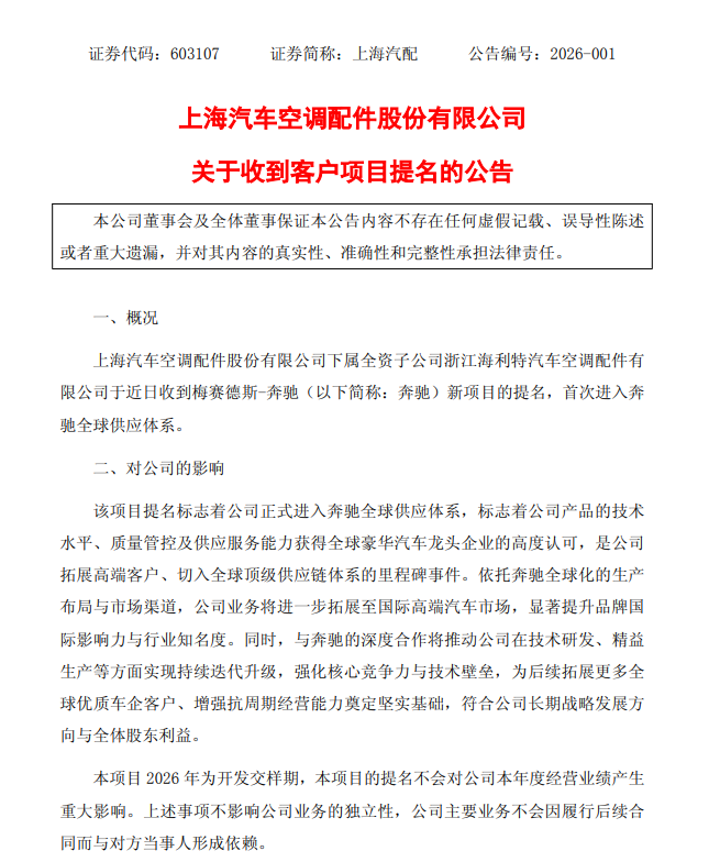1月21日,上海汽配(603107.SH)公告称,公司下属全资子公司浙江海利特收到梅赛德斯-奔驰新项目的提名,首次进入奔驰全球供应体系。这一提名标志着公司产品的技术水平、质量管控及供应服务能力获得全球豪华汽车龙头企业的高度认可,是公司拓展高端客户、切入全球顶级供应链体系的里程碑事件。本项目2026年为开发交样期,本项目的提名不会对公司本年度经营业绩产生重大影响。