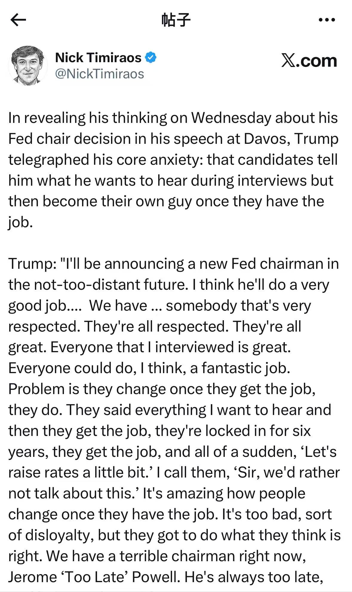 据有“美联储新通讯社”之称的知名记者Nick Timiraos消息,当地时间1月22日,美国总统特朗普在达沃斯发表讲话,透露了他对美联储主席人选的看法,显示出他内心深处的焦虑:美联储主席候选人在面试时会说他想听的话,但一旦上任,就会变成他自己。