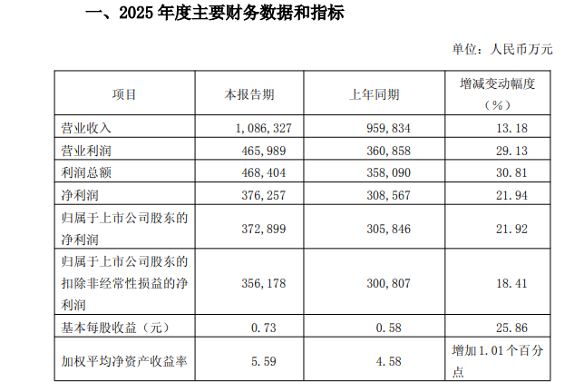 公司实现营业收入108.63亿元、同比增长13.18%,归属于上市公司股东的净利润37.29亿元、同比增长21.92%。