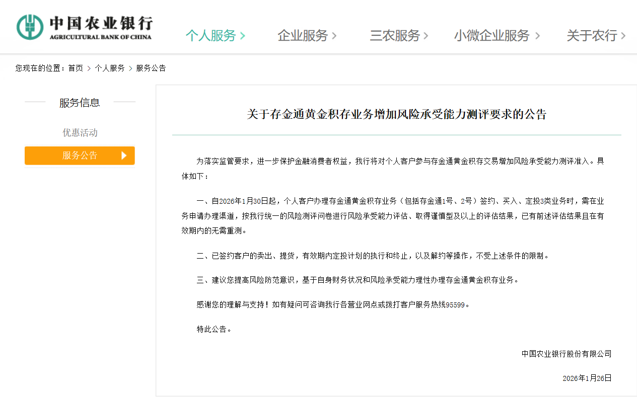 1月26日,农业银行(601288.SH)官网发布公告,为落实监管要求,进一步保护金融消费者权益,农业银行将对个人客户参与存金通黄金积存交易增加风险承受能力测评准入。