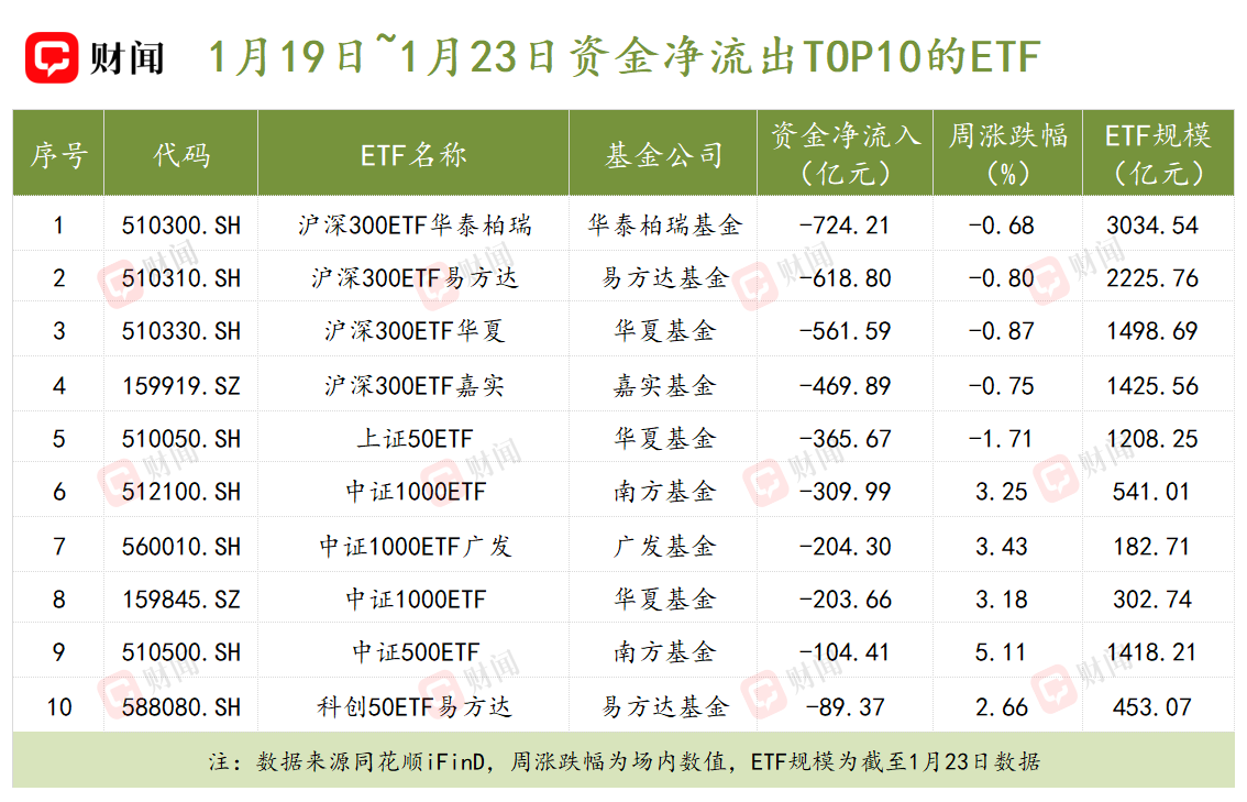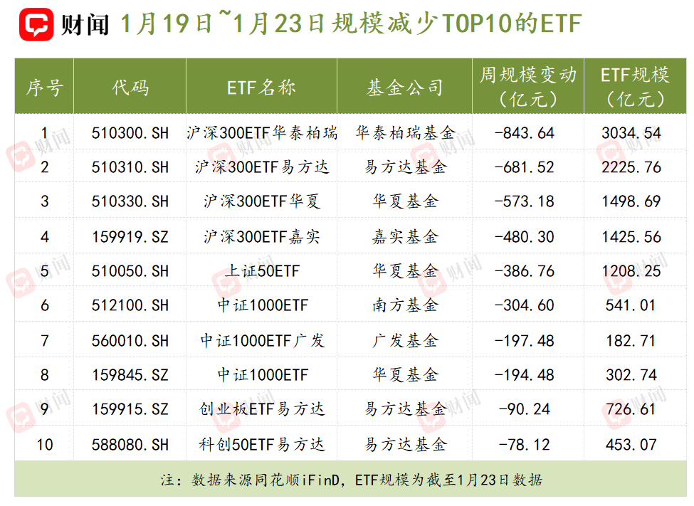 另一方面,在规模缩减的产品中,华泰柏瑞沪深300ETF(510300.SH)当周规模减少843.64亿元,截至1月23日仍以3034.54亿元的规模稳居全市场首位,继续领跑全市场ETF产品。