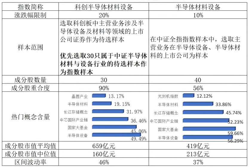 从标的选择上来看,目前市场上聚焦半导体设备的指数有两只,分别是中证半导体材料设备以及科创半导体材料设备指数。前者是科创板中唯一聚焦半导体设备的指数,后者体现行业整体布局,是全市场半导体设备含量最高的指数。(数据来源:Wind,成分行业按申万三级行业划分)