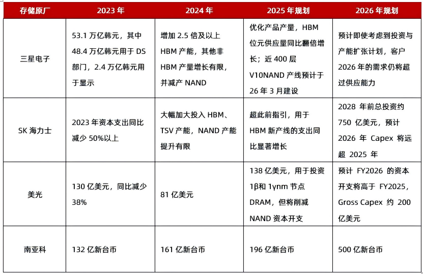 全球头部存储厂资本支出规划