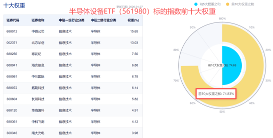 半导体设备ETF(561980)跟踪中证半导,重仓中微公司、北方华创(002371.SZ)等设备龙头以及晶圆厂龙头中芯国际,芯片设计龙头海光信息(688041.SH)、寒武纪和材料龙头南大光电(300346.SZ)等,前十大集中度约75%,在同类指数中位居前列。