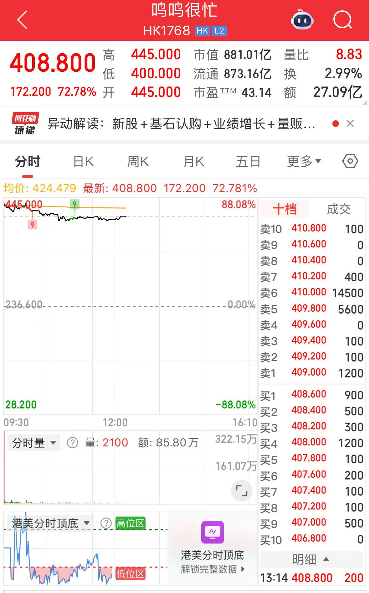 总市值881亿港元 鸣鸣很忙上市首日盘内涨超88%