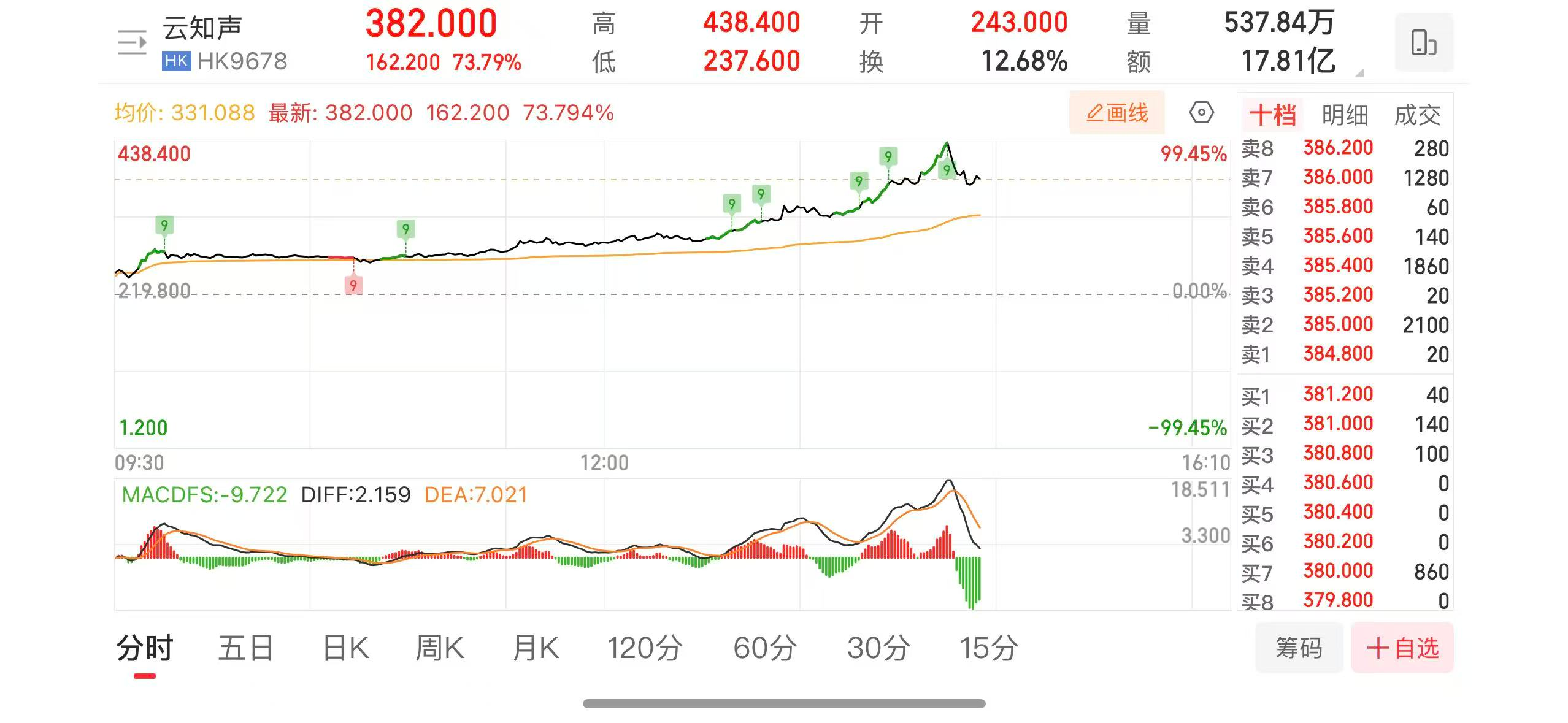 1月28日,云知声(09678.HK)午后涨幅扩大,盘中一度涨幅超90%,截至发稿,涨超73%,报价382港元,成交额超17亿港元。