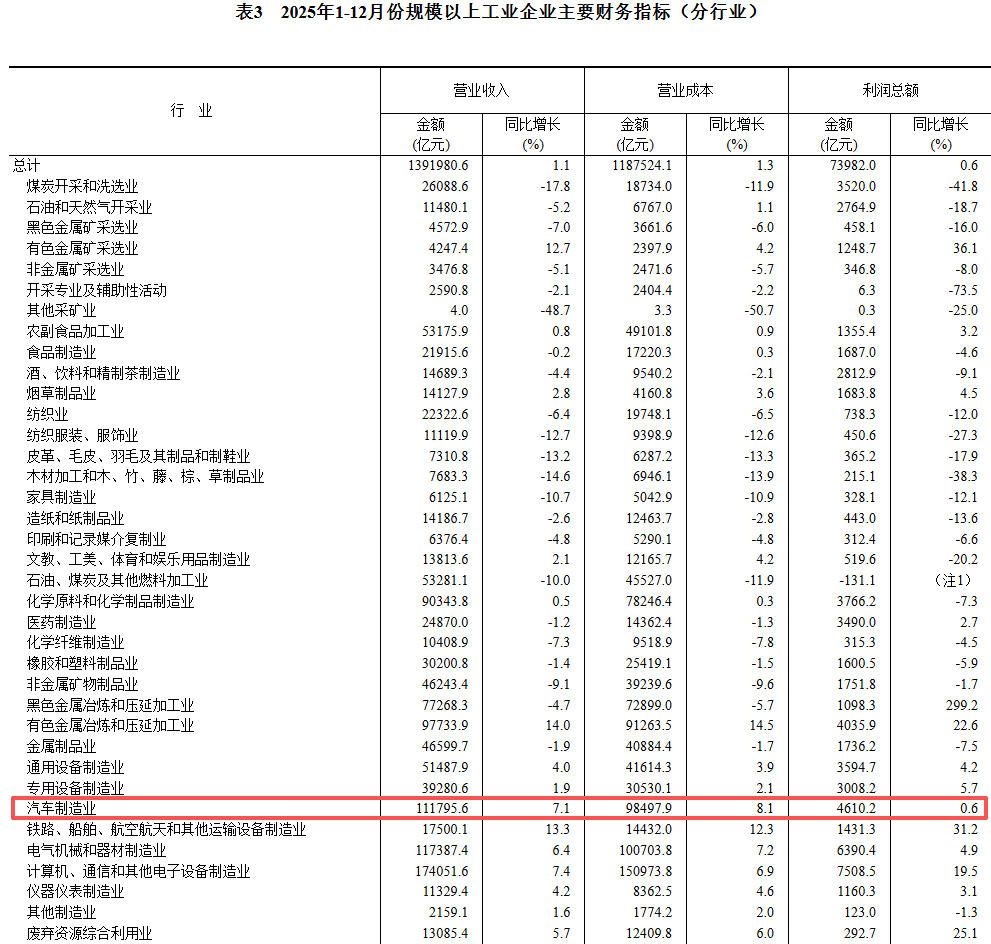 与之形成对比的是,行业规模仍在持续扩大,2025年汽车制造业实现营收111796亿元,同比增长7.1%,但成本增速更快,全年成本高达98498亿元,同比增长8.1%,利润仅实现4610亿元,同比微增0.6%,凸显增收不增利的困境。