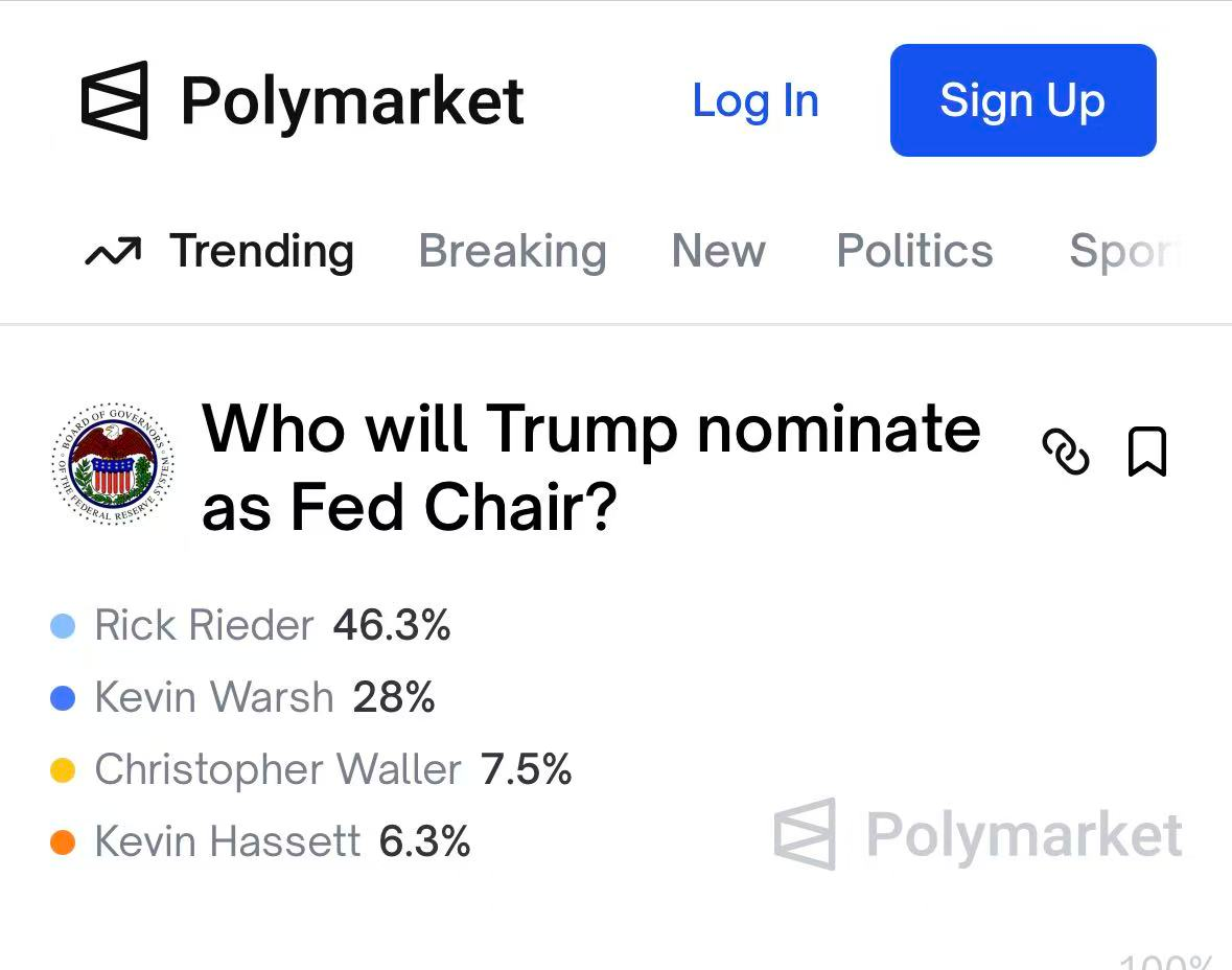 根据Polymarket数据,截至1月28日,里德成为下一任美联储主席的最热门人选,当选概率飙升至46.3%,凯文·沃什当选的概率升至28%,位居预测榜第二位,而此前一度领先的白宫经济顾问哈塞特当选概率则降至6.3%,排名最后。