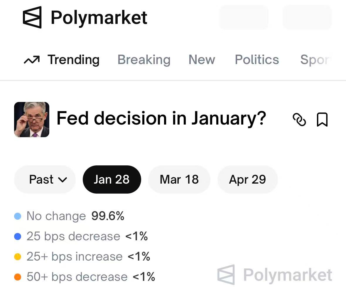 美东时间1月28日下午2点(北京时间1月29日凌晨3点),美联储即将公布2026年的首份利率决议。当前市场已完全消化美联储本次会议维持利率在3.50%~3.75%不变的预期,市场预测平台Polymarket数据显示,美联储将在1月议息会议上保持利率不变的概率高达99.6%。