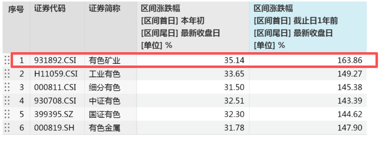 因此从历史涨幅看,有色矿业指数表现出更强的进攻性,今年以来涨幅超35%,近一年涨幅164%,领跑所有有色主题指数。