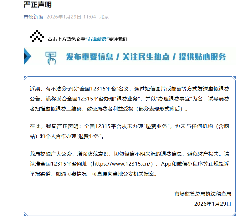 1月29日,据市场监管总局消息,近期,有不法分子以“全国12315平台”名义,通过短信图片或邮寄等方式发送虚假退费公告,谎称联合全国12315平台办理“退费业务”,并以“办理退费事宜”为名,诱导消费者扫描虚假退费二维码,致使消费者利益受损。