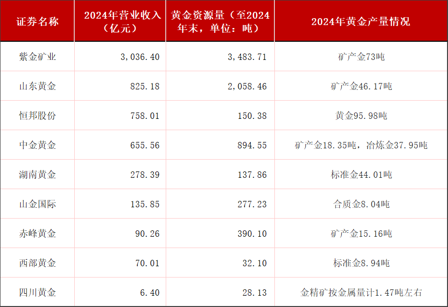 按产量看,恒邦股份(002237.SZ)2024年黄金产量达到95.98吨,但恒邦股份较少动用自有矿山资源开发,冶炼用原材料主要依靠外购,并非矿产金。