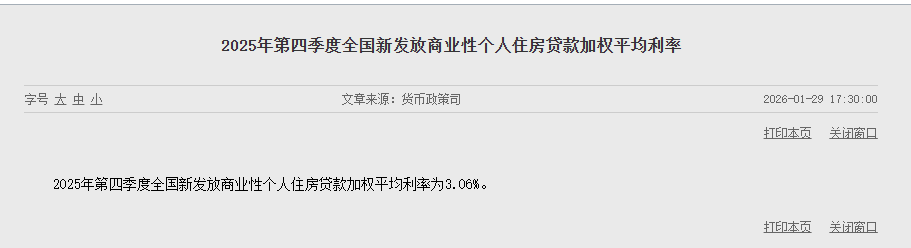 央行:2025年第四季度全国新发放商业性个人住房贷款加权平均利率为3.06% 财闻 2026-01-29 17:58:22 1月29日,据央行官网消息,2025年第四季度全国新发放商业性个人住房贷款加权平均利率为3.06%。 1月29日,据央行官网消息,2025年第四季度全国新发放商业性个人住房贷款加权平均利率为3.06%。