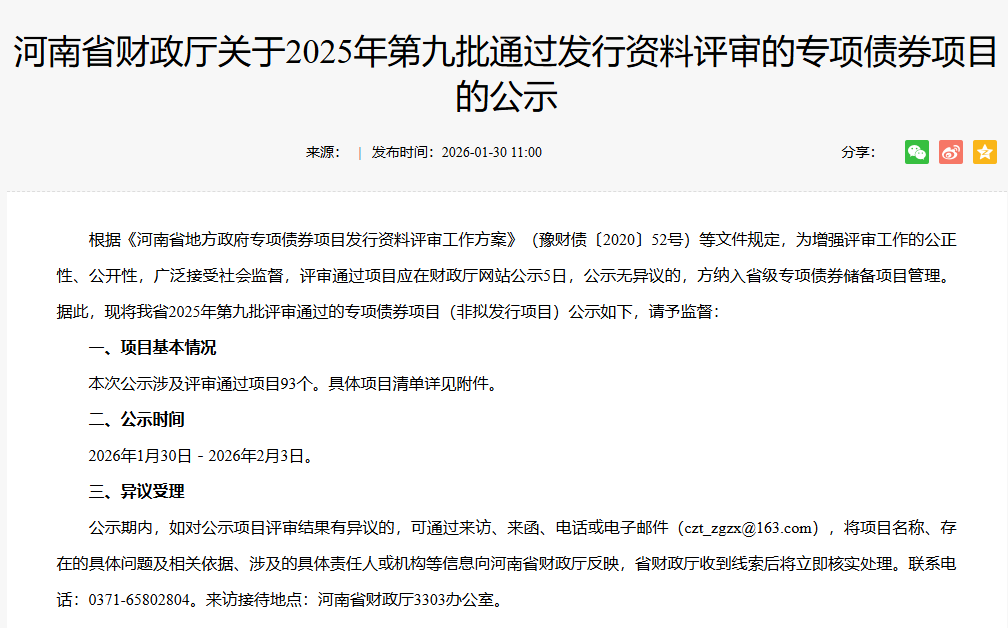 1月30日,河南省财政厅公示2025年第九批通过发行资料评审的专项债券项目(非拟发行项目),本次公示涉及评审通过项目93个,申报发债总额91.237亿元,公示时间为2026年1月30日—2026年2月3日。