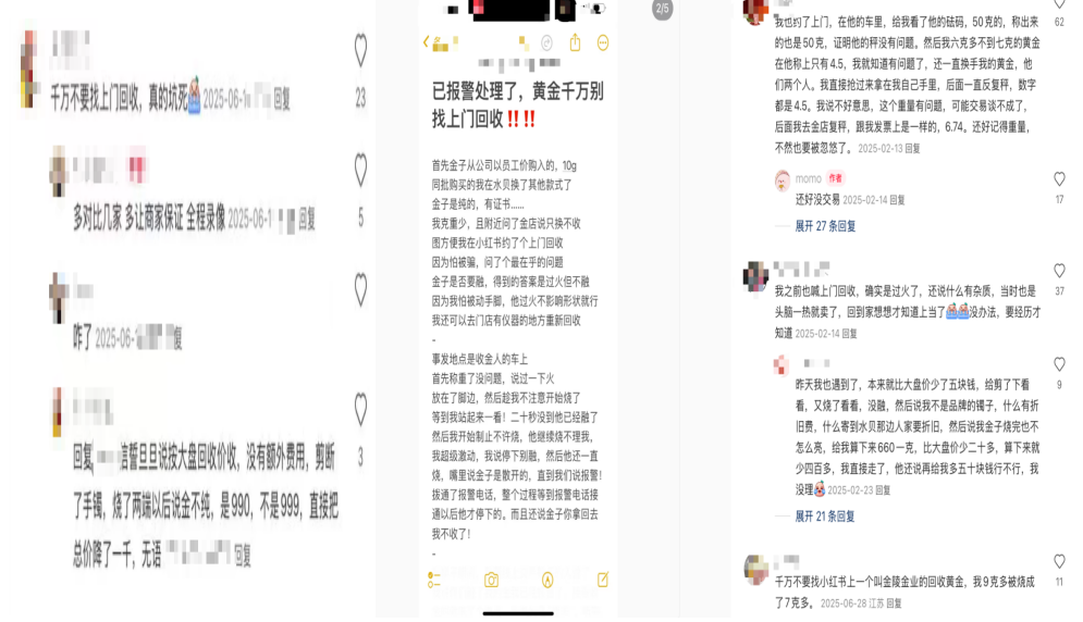 有网友分享经历:出售金手镯时,对方上门后剪断并焚烧两端,随即以“纯度不足”为由,将总价直接砍掉千元。在小红书等社交平台上,类似“克重不符”“杂质过多”等话术,已成为二手贵金属回收骗局中的高频关键词。