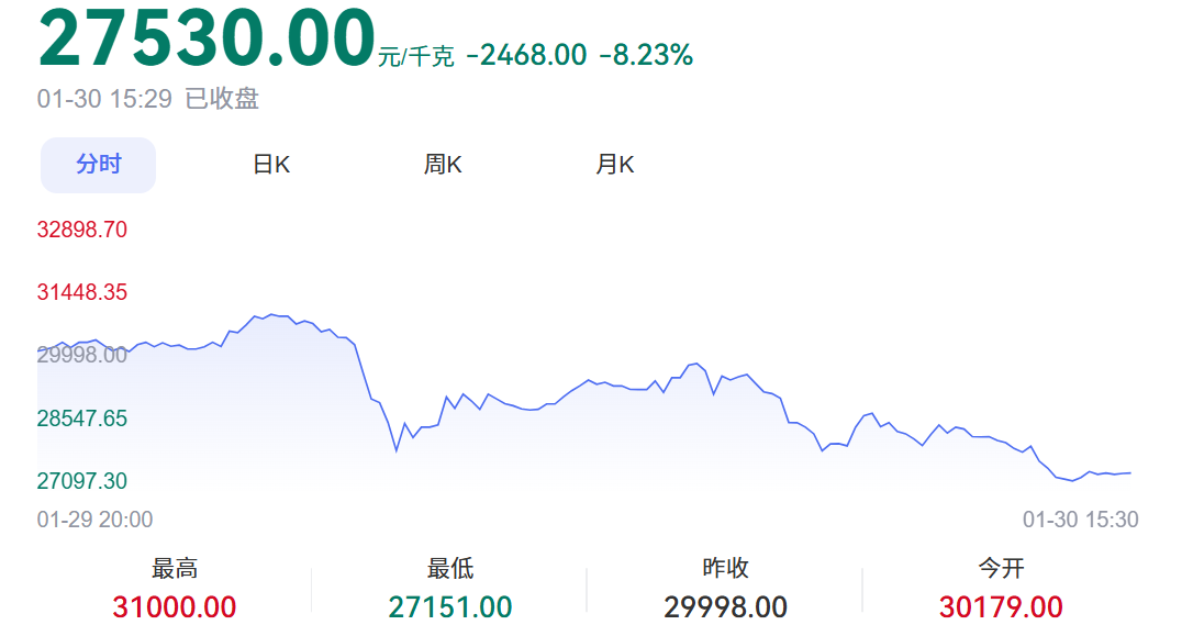 1月30日,上海黄金交易所显示的白银大盘价格(白银T+D)最高31元/克,最低27.15元/克。以贵金属回收平台融通金为例,其白银回收价格通常为大盘下浮约2元/克,这一水平被大众普遍视为合理“基准”。根据融通金公众号30日上午10时10分的报价,其白银回购价格为28.30元/克。