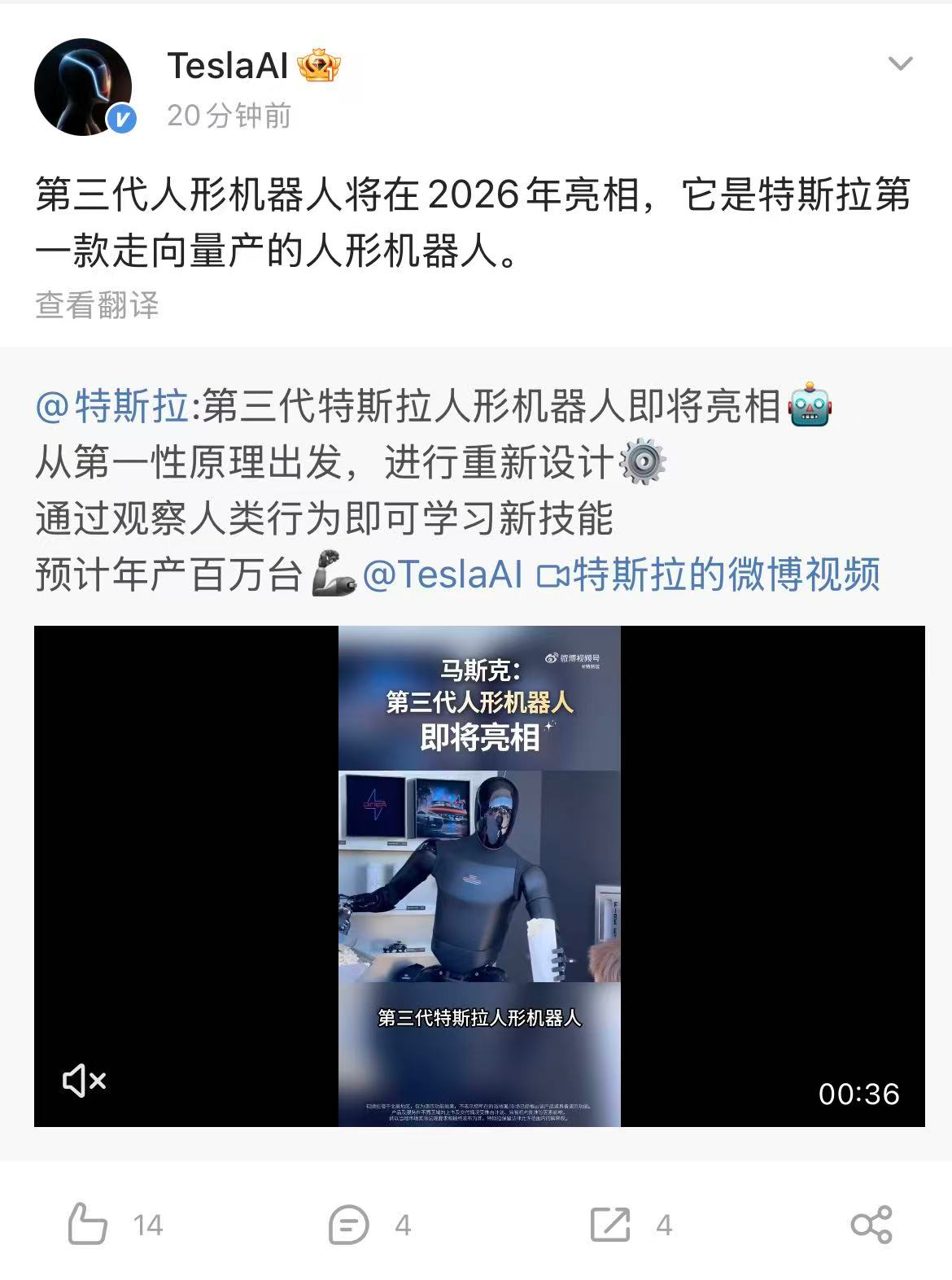 第三代特斯拉人形机器人将在2026年亮相,预计年产百万台