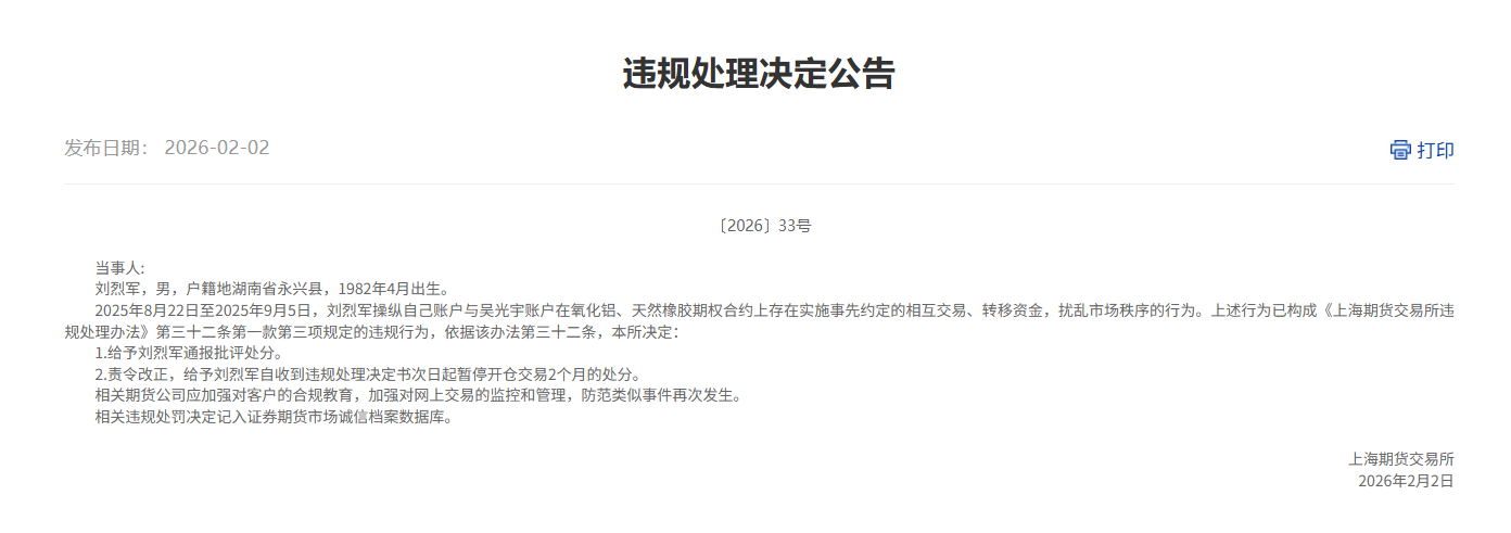 同日,另一则违规处理决定公告显示,2025年8月22日至2025年9月5日,刘烈军操纵自己账户与吴光宇账户在氧化铝、天然橡胶期权合约上存在实施事先约定的相互交易、转移资金,扰乱市场秩序的行为。上海期货交易所决定给予刘烈军通报批评处分,责令改正,并给予刘烈军自收到违规处理决定书次日起暂停开仓交易2个月的处分。