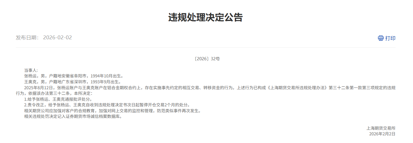 2月2日,上海期货交易所发布违规处理决定公告。公告指出,2025年8月12日,张杨运账户与王奥克账户在铝合金期权合约上,存在实施事先约定的相互交易、转移资金的行为。上海期货交易所决定给予张杨运、王奥克通报批评处分;责令改正,给予张杨运、王奥克自收到违规处理决定书次日起暂停开仓交易2个月的处分。