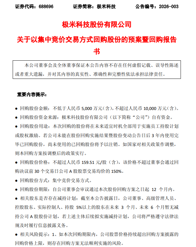 2月2日,极米科技(688696.SH)公告称,公司拟以集中竞价交易方式回购股份,资金总额不低于5000万元(含),不超过1亿元(含)。回购价格不超过159.51元/股。回购的股份将在未来适宜时机全部用于实施员工持股计划或股权激励。若公司未能在股份回购实施结果暨股份变动公告日后3年内使用完毕已回购股份,尚未使用的已回购股份将予以注销。