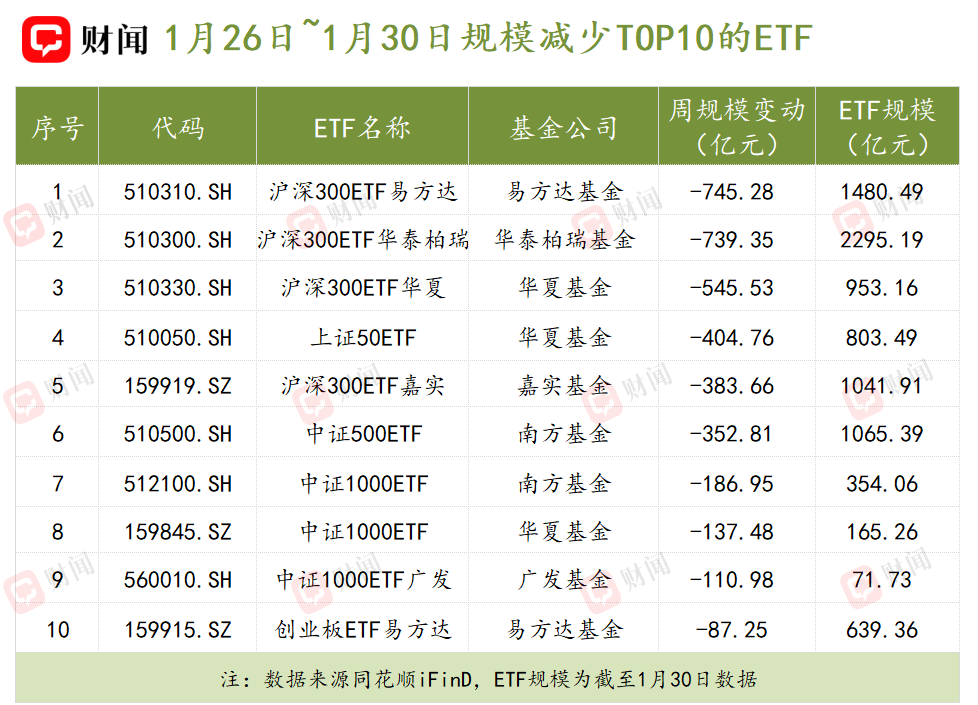 相比之下,宽基ETF则成为规模缩水最明显的类别。其中,沪深300ETF华泰柏瑞(510300.SH)在1月内规模从4000亿元级别大幅回落至2000亿元区间。截至1月30日,该基金规模为2295.1亿元,虽较月初明显下降,但仍稳居全市场首位,是目前唯一一只规模超过2000亿元的ETF产品。