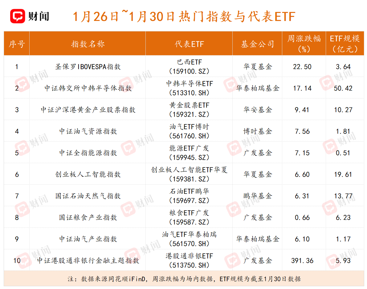 除贵金属外,全球油气资源价格上周同样显著上扬,不仅带动A股相关能源股走强,也助推了巴西ETF(159100.SZ)全周大涨22.50%,位居全市场ETF涨幅榜首。该基金跟踪圣保罗IBOVESPA指数,而该指数在当地时间1月29日创下历史新高。