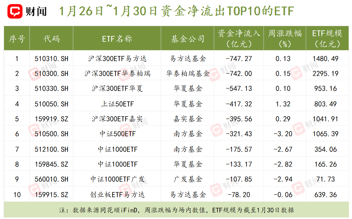 在资金净流出方面,上周共有9只ETF净流出规模超百亿元,且全部为宽基类产品。其中,沪深300相关ETF仍是资金撤离的“重灾区”:沪深300ETF易方达(510310.SH)与沪深300ETF华泰柏瑞(510300.SH)单周净流出金额均超过700亿元,为市场继续降温。