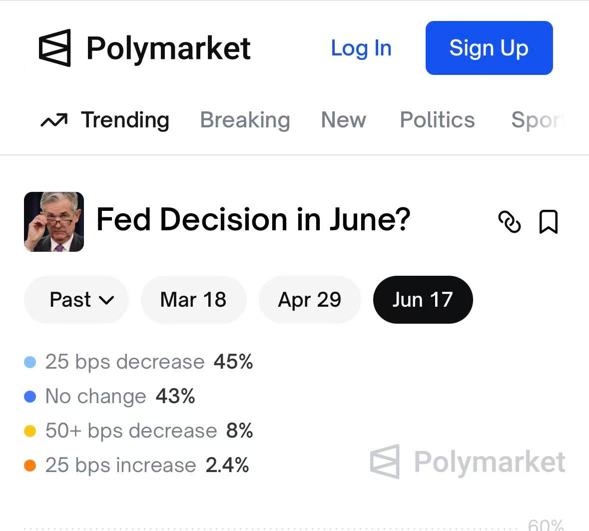 截至2月3日,市场预测平台Polymarket数据显示,美联储3月维持利率不变的概率达90%;到4月累计降息25个基点的概率为16%,维持利率不变的概率为76%;到6月累计降息25个基点的概率为45%,维持利率不变的概率为43%。