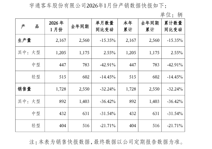 2月3日,宇通客车(600066.SH)发布了2026年1月份产销数据快报。数据显示,2026年1月公司生产量2167辆,同比下降15.35%;其中大型1205辆同比增长2.55%,中型447辆同比下降42.91%,轻型515辆同比下降14.45%。