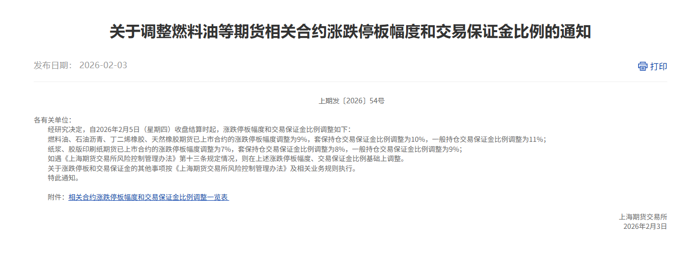 2月3日,据上期所公告,经研究决定,自2026年2月5日(星期四)收盘结算时起,涨跌停板幅度和交易保证金比例调整如下: 燃料油、石油沥青、丁二烯橡胶、天然橡胶期货已上市合约的涨跌停板幅度调整为9%,套保持仓交易保证金比例调整为10%,一般持仓交易保证金比例调整为11%;