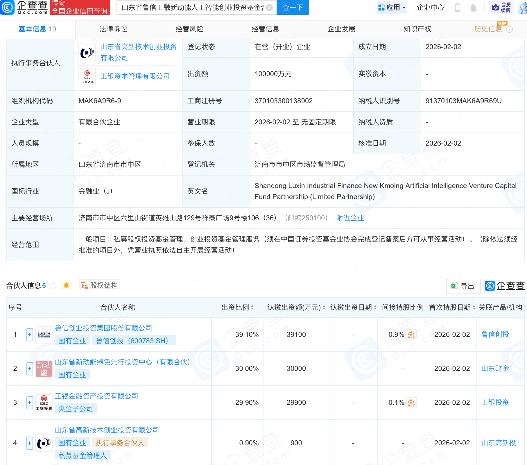 企查查APP显示,近日,山东省鲁信工融新动能人工智能创业投资基金合伙企业(有限合伙)成立,出资额10亿元,经营范围包含:私募股权投资基金管理、创业投资基金管理服务。企查查股权穿透显示,该公司由鲁信创投(600783.SH)、工银金融资产投资有限公司等共同出资。