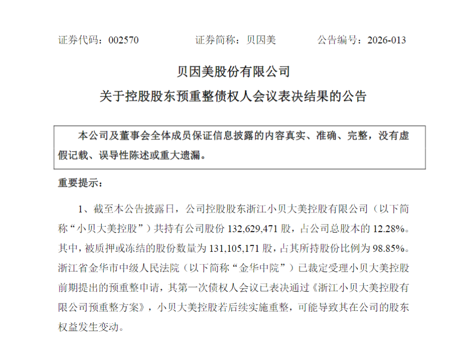 2026年1月27日,贝因美再次发布债权人会议通知公告,决定以非现场表决方式,讨论《浙江小贝大美控股有限公司预重整方案》。后续的表决结果公告及本次公告,也意味着小贝大美预重整方案即将落地实施。