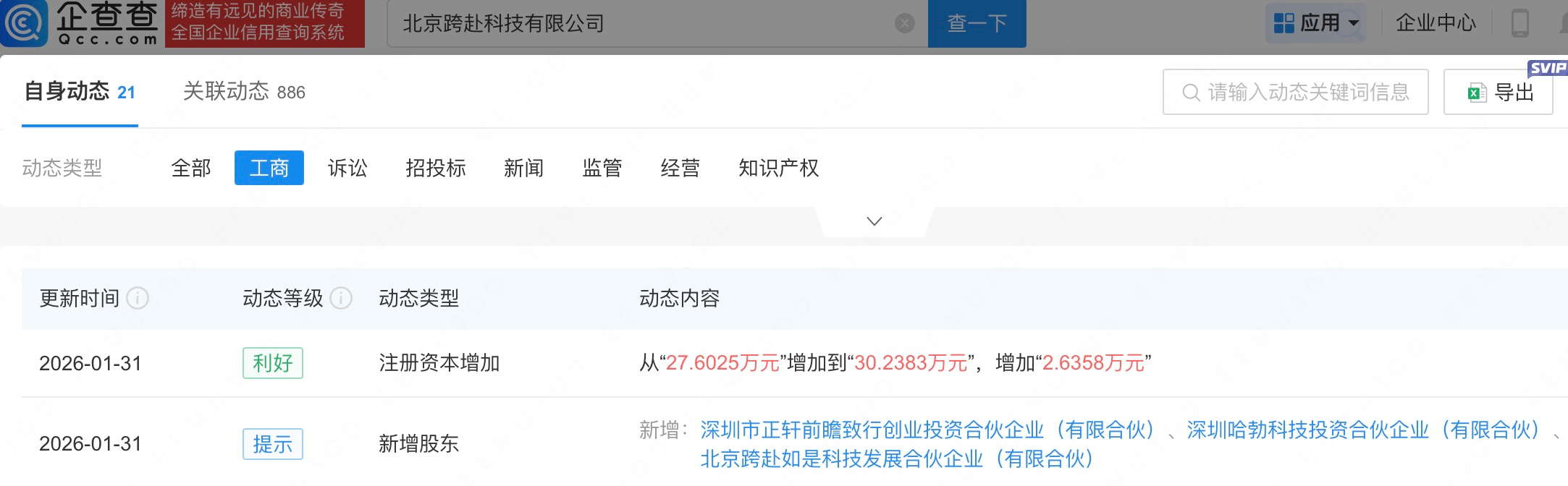 企查查APP显示,近日,北京跨赴科技有限公司发生工商变更,新增华为旗下深圳哈勃科技投资合伙企业(有限合伙)等为股东,同时,注册资本由约27.6万人民币增至约30.2万人民币。企查查信息显示,该公司成立于2023年,经营范围包括人工智能应用软件开发、软件销售、软件外包服务等。官网显示,该公司致力于为每个企业配备无人的软件开发工厂。