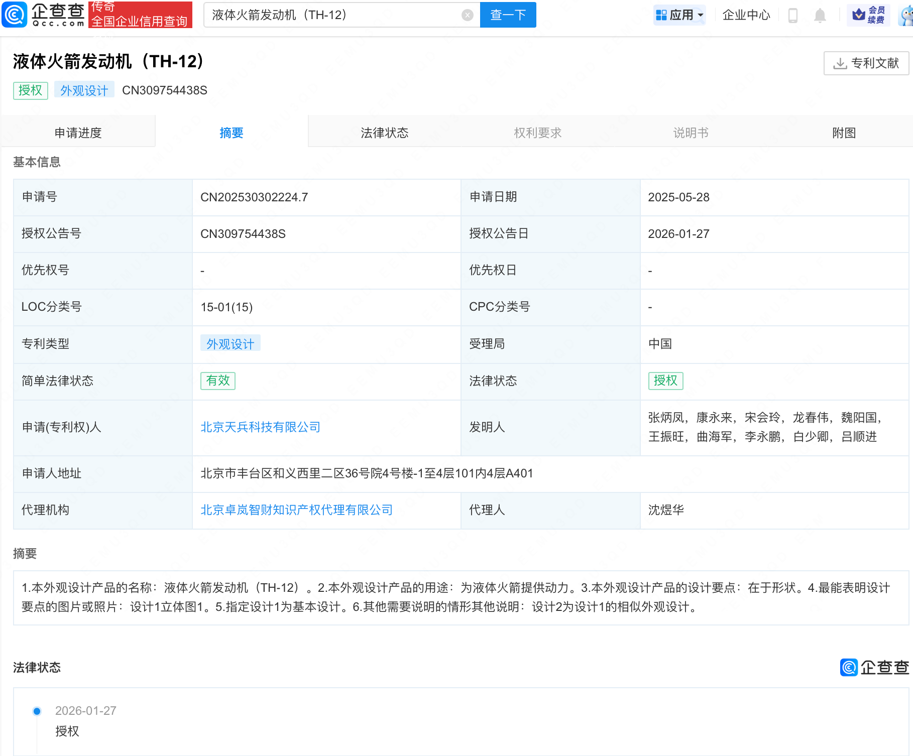 企查查APP显示,近日,江苏天兵航天科技股份有限公司全资子公司北京天兵科技有限公司申请的“液体火箭发动机(TH-12)”外观设计专利获授权。企查查专利摘要显示,本外观设计产品的用途在于为液体火箭提供动力,其设计要点在于形状。
