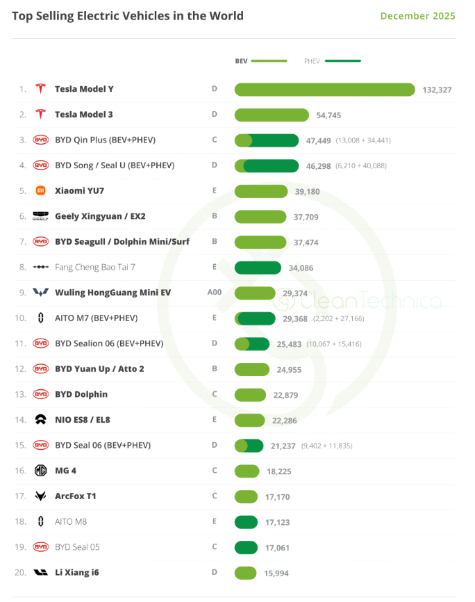 2025年12月全球最畅销电动车型TOP20出炉:特斯拉包揽冠亚军,比亚迪8款在列