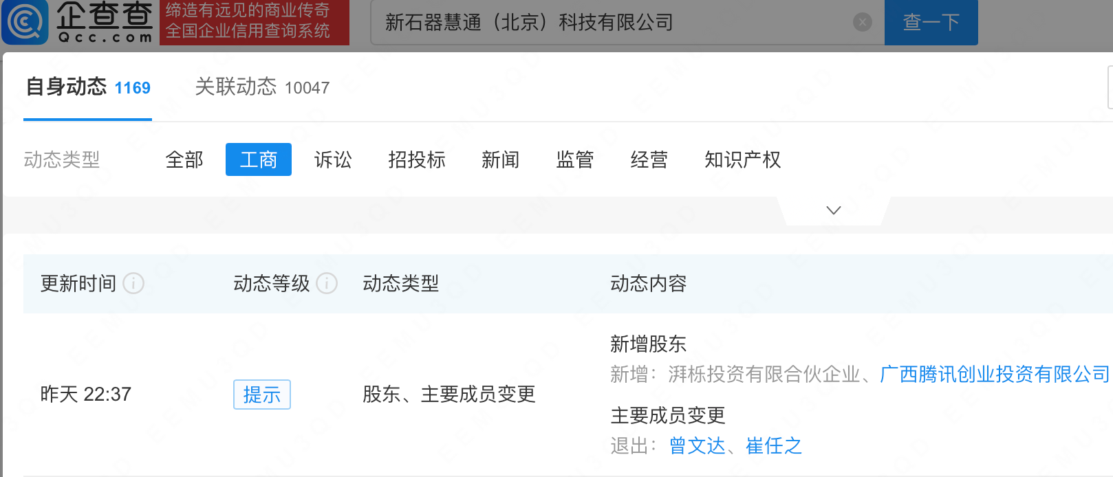 企查查APP显示,近日,新石器无人车关联公司新石器慧通(北京)科技有限公司发生工商变更,新增广西腾讯创业投资有限公司等为股东。企查查信息显示,该公司成立于2018年,经营范围包含:智能机器人的研发;智能机器人销售;工业机器人销售;人工智能硬件销售;人工智能应用软件开发等。公开信息显示,新石器专注于将L4级无人驾驶应用于物流场景,尤其是城市配送场景。