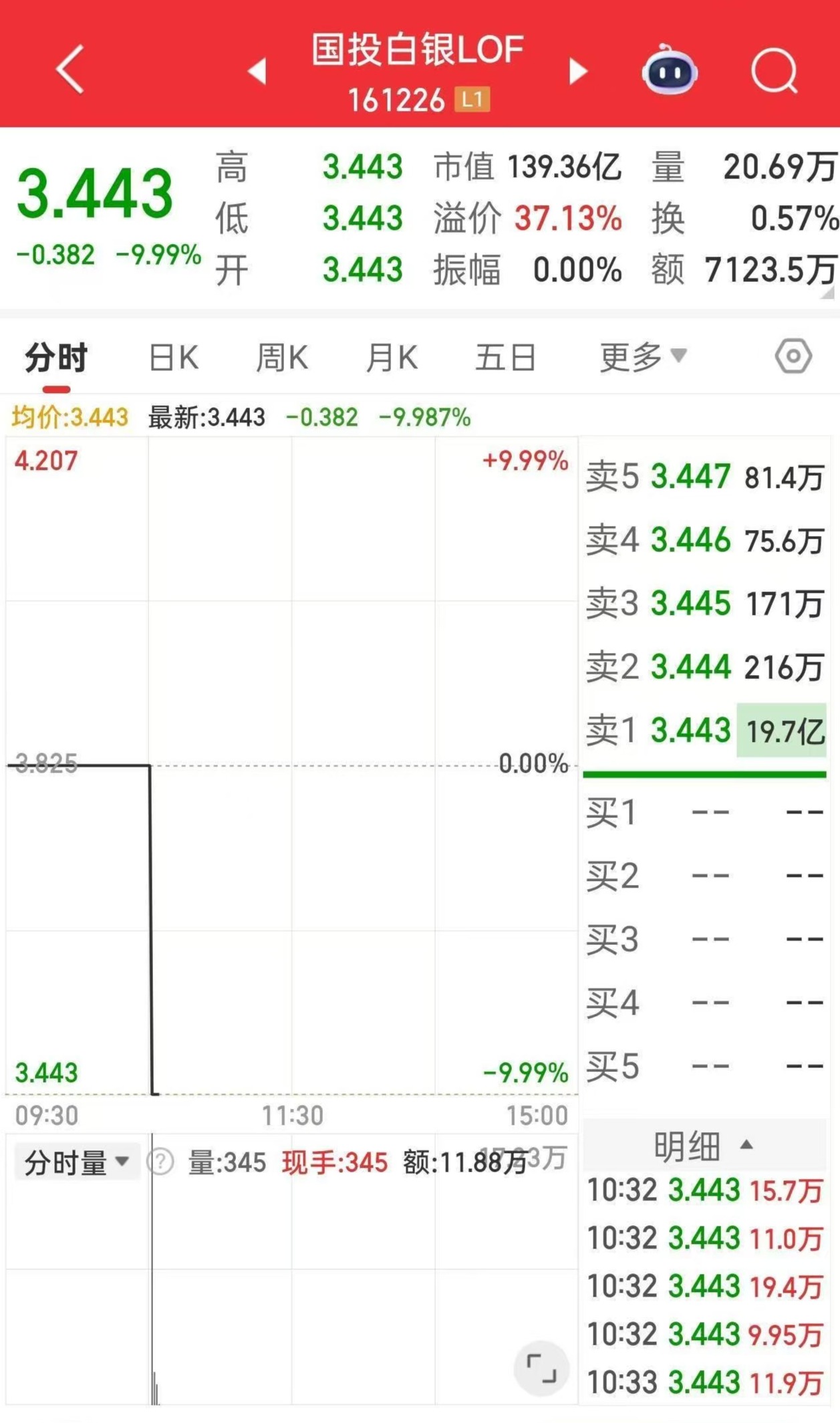 与此同时,国投白银LOF(161226)连续第四日复牌跌停,报3.443元,最新溢价率为37.12%,封单仍有近20亿元。