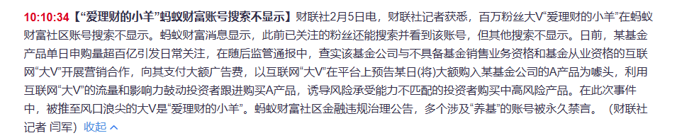 2月5日,有媒体报道称,百万粉丝大V“爱理财的小羊”在蚂蚁财富社区账号搜索不显示。蚂蚁财富消息显示,此前已关注的粉丝还能搜索并看到该账号,但其他搜索不显示。日前,某基金产品单日申购量超百亿引发日常关注,在随后监管通报中,查实该基金公司与不具备基金销售业务资格和基金从业资格的互联网“大V”开展营销合作,向其支付大额广告费,以互联网“大V”在平台上预告某日(将)大额购入某基金公司的A产品为噱头,利用互联网“大V”的流量和影响力鼓动投资者跟进购买A产品,诱导风险承受能力不匹配的投资者购买中高风险产品。在此次事件中,被推至风口浪尖的大V是“爱理财的小羊”。蚂蚁财富社区金融违规治理公告,多个涉及“养基”的账号被永久禁言。