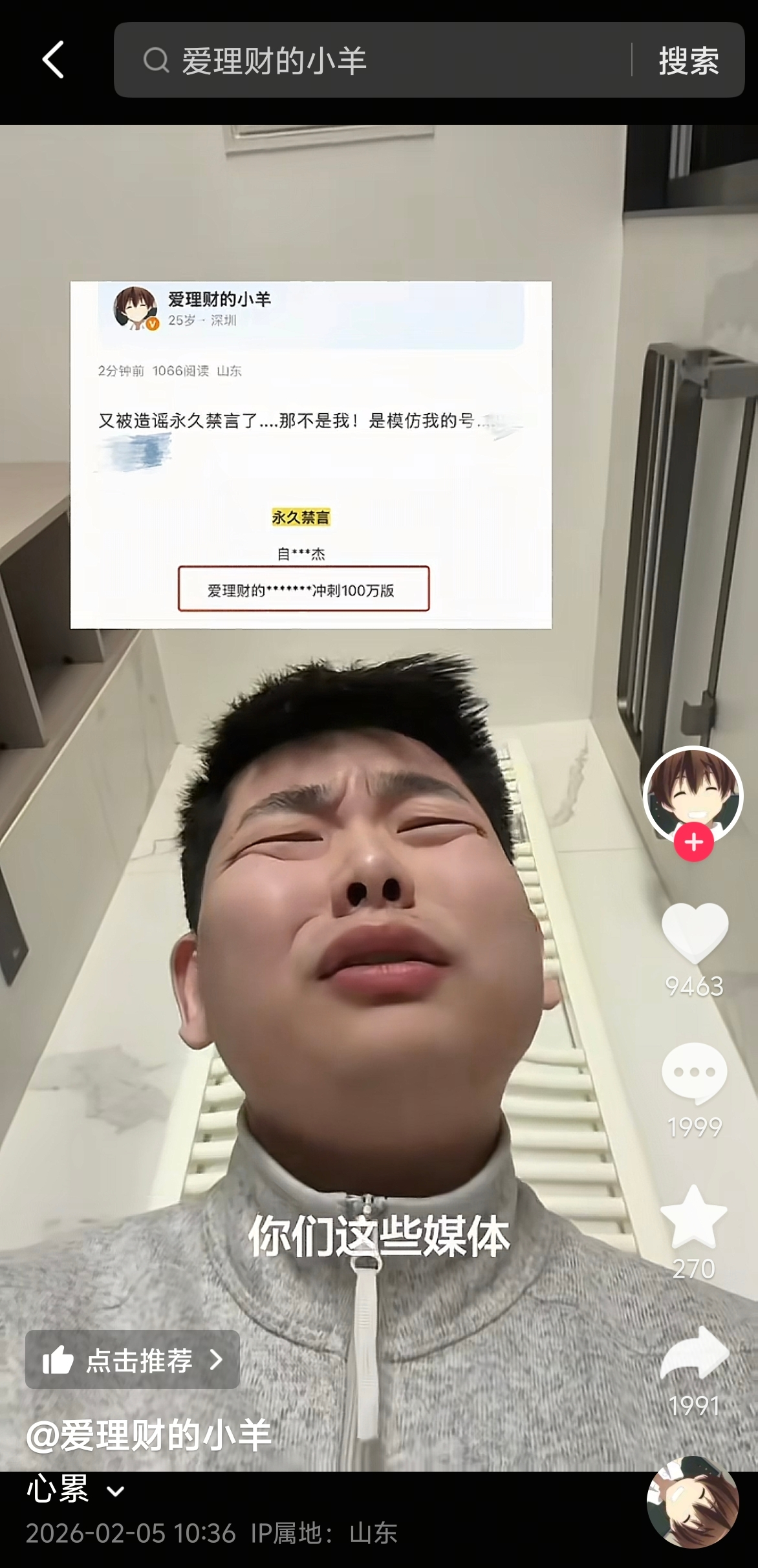 媒体称被永久禁言,百万粉丝大V“爱理财的小羊”连发视频辟谣