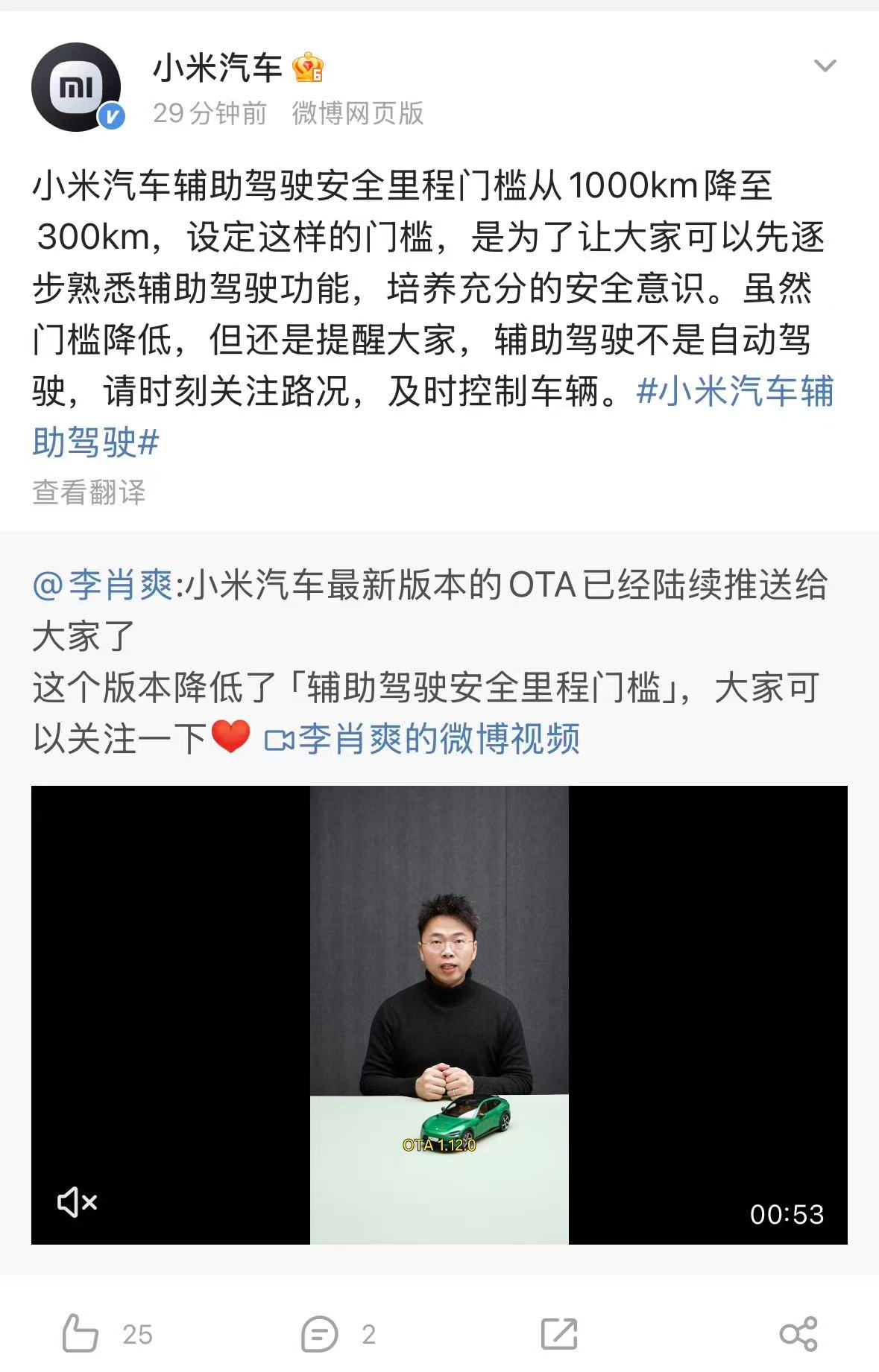 2月5日,小米汽车官方微博宣布,最新版本OTA已陆续推送,辅助驾驶安全里程门槛降低。小米汽车介绍,辅助驾驶安全里程门槛从1000km降至300km,设定这样的门槛,是为了让大家可以先逐步熟悉辅助驾驶功能,培养充分的安全意识。小米汽车提醒,辅助驾驶不是自动驾驶,请时刻关注路况,及时控制车辆。
