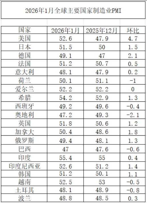 2月6日,中国物流与采购联合会发布,2026年1月份全球制造业PMI为51%,较上月上升1.5个百分点,结束连续10个月50%以下的运行趋势。