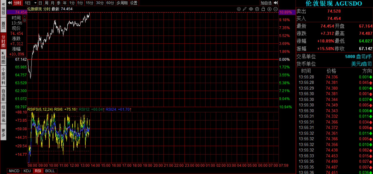 当日,伦敦银现站上74美元/盎司,日内涨10.82%。现货黄金站上4870美元/盎司,日内涨1.96%,推动板块情绪修复。